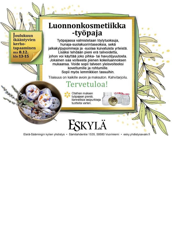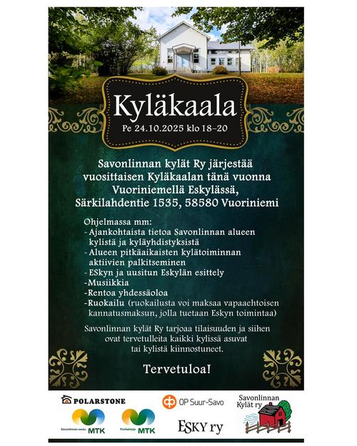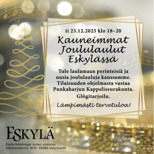 Syyskaudella 2025 Eskylässä jatkuivat vielä kunnostustyöt samalla, kun taloa hyödynnettiin lukuisiin tapahtumiin. Alla on kovakooste syys- joulukuun tapahtumista. Klikkaamalla kuvia, saat ne suuremmaksi ja esiin tulee myös selittävä teksti.